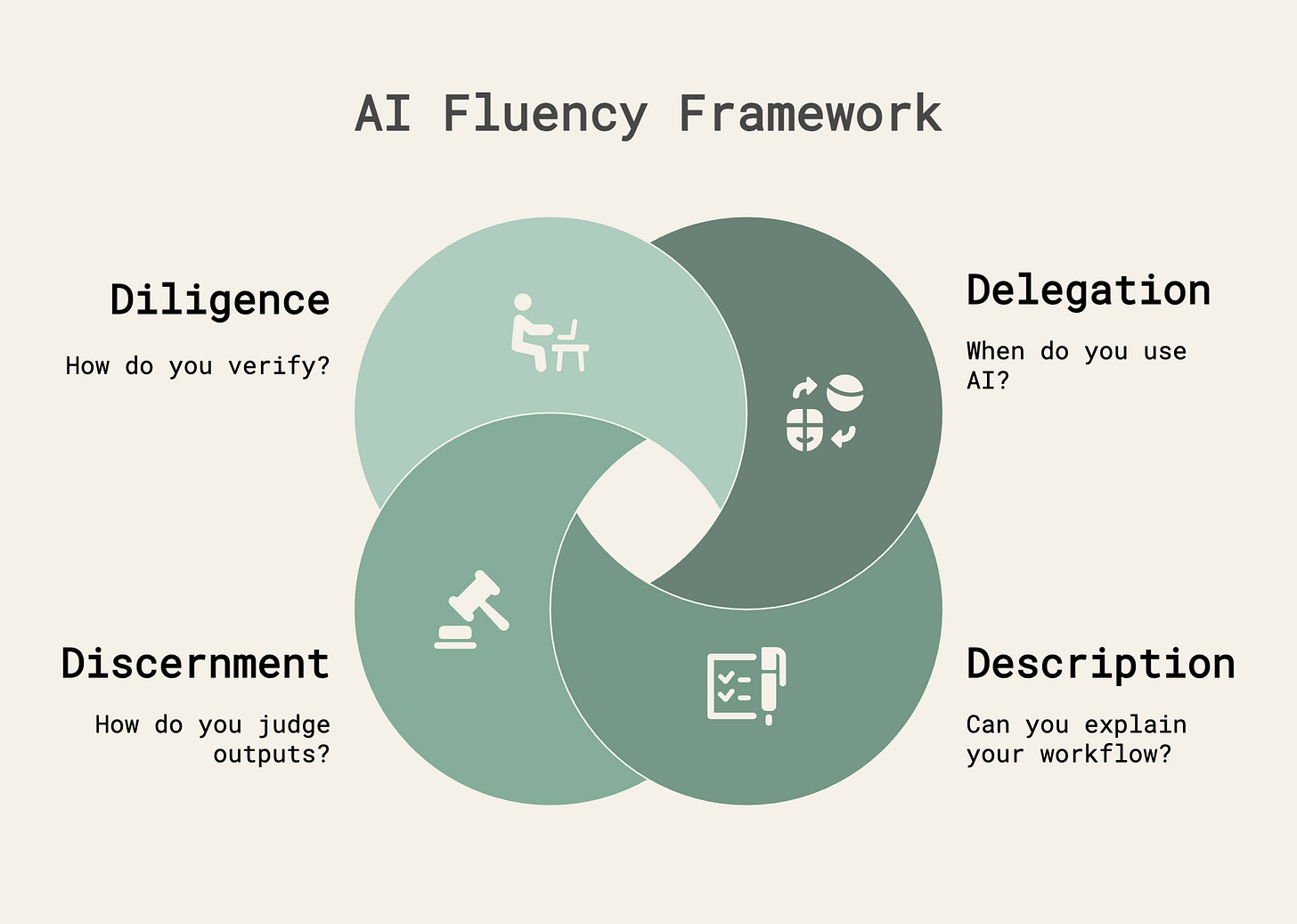 Instead of asking “did you use AI?”, test for the four dimensions that matter. Anthropic’s identifies these as Delegation, Description, Discernment, and Diligence.